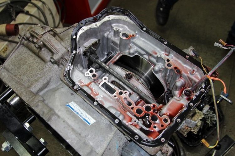 Ну вот мы и добрались до самого сердца вариатора, полностью сняв все элементы гидроблока. В нашем случае он состоял из 6 пластин. Теперь мы можем увидеть цепь, которая натянута меж двух конусных валов. На вид сердце агрегата вполне рабочее, каких то выпавших зубцов и сколов мы не наблюдаем. Механик советует не обольщатся, ведь машина и приехала своим ходом.