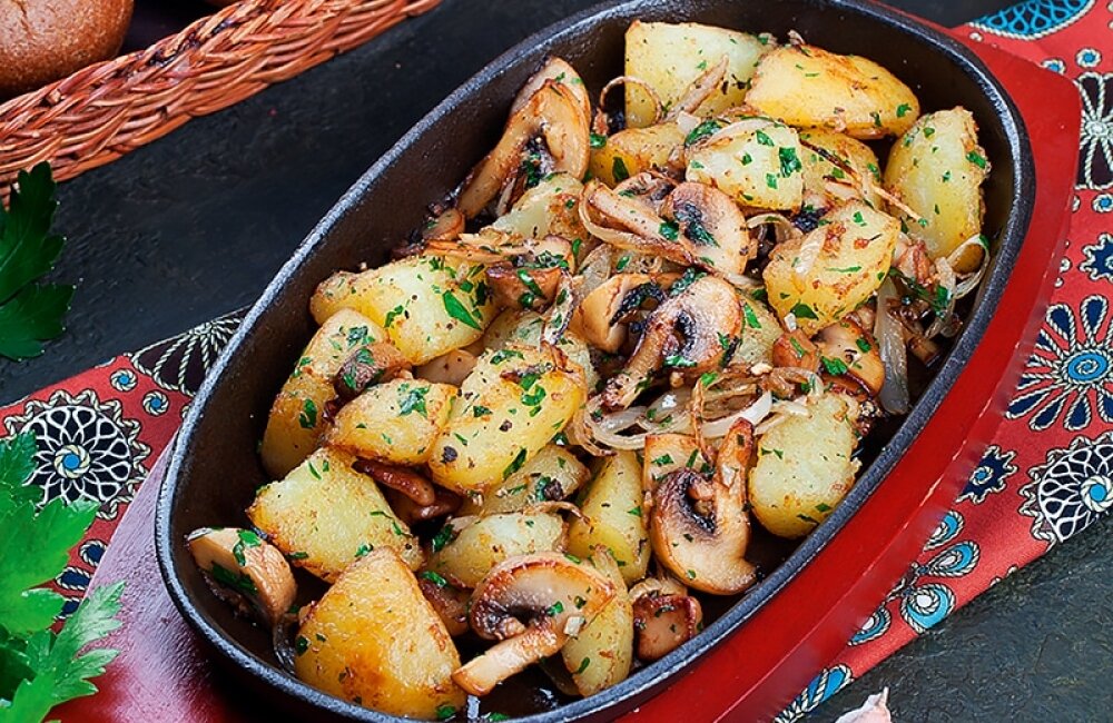 Что можно приготовить из свежих грибов? Самое быстрое это жаренная картошечка! Просто, но и тут надо знать несколько хитростей что бы ваш ужин не превратился в кашу на сковороде!))) 1. Соль. Когда лучше солить? Дело в том, что соль заставляет любой продукт выделять сок. Тоже самое и с картофелем. По - этому солим тогда, когда картофель достаточно поджарен со всех сторон, то есть в конце приготовления. 2. Важно! Бросать картофель на хорошо разогретую сковороду, жарим на сильном огне периодически помешивая. Накрывать крышкой только в конце, уменьшив огонь, когда картофель почти готов. 3. Сорт картофеля. Лучший (на мой взгляд) для жарки тот что с темной кожурой. 4. Посуда. Хорошо если на вашей кухне есть чугунная сковорода (по старинке), с толстым дном и стенками, идеальна для жаренной картошечки! 5. С какими грибами жарить картофель? Подойдут шампиньоны, лисички, белые, маслята, подосиновики. Ингредиенты: · 500 – 600 гр. грибов · 1 кг картофели (или меньше или больше, зависит