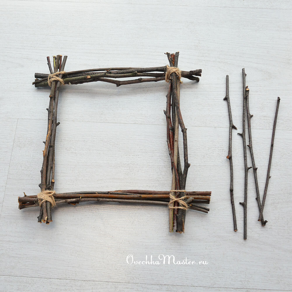 Всем добрый день. Сегодня совсем другое окошко, отличающееся от предыдущих. И назначение иное - такое хорошо будет смотреться в коридоре около входа! Для этой композиции я сделала основу из нескольких тонких веточек и приготовила еще отдельно 4. Приклеиваю оставшиеся ветки следующим образом. И дальше с оконной рамой больше ничего не делаю, оставляю как есть. Дальше сделала из вощеного шнура лапки для совы. Просто обмотала 3 раза вокруг ветки и завязала на узел. Приклеиваю к лапками сову. Но она естественно держаться не будет. Слишком большая сова и слишком тонкая веточка. Поэтому я ее дополнительно прикрепляю к верхним веткам с помощью прозрачной нитки. Она практически не видна на близком расстоянии, а издалека уж тем более. А как сделать такую сову я подробно показала в этой статье. Но если такой вариант не нравится - можно сделать сзади еще дополнительные веточки, которые будут поддерживать сову. Я же хочу оставить открытое пространство. Приклеиваю табличку, сделанную из фетра. Над