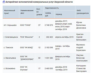 Антирейтинг самых злостных неплательщиков среди управляющих компаний, ТСЖ и ЖСК составили амурские энергетики. В списке должников пять управляющих компаний. Четыре из них осуществляют свою деятельность в соседствующих с Белогорском районах. Антирейтинг возглавила компания «ГУЖФ» из поселка Серышево. Это предприятие должно за потребленную электроэнергию более 2,7 млн. рублей, причем неоплаченными остаются счета, выставленные за несколько месяцев 2017-2018 годов и в текущем году. Более двух миллионов рублей должна управляющая компания «МЖД», которая осуществляет свою деятельность в селе Томское Серышевского района. Порядка 2,5 млн. рублей не получили энергетики от управляющей компании «Спутник» из села Возжаевка Белогорского района. Миллионный долг накопила и управляющая компания «Домосервис» села Васильевка Белогорского района. При составлении антирейтинга энергетики учли выполнение потребителями обязательств, предусмотренных условиями договора энергоснабжения, размер задолженности
