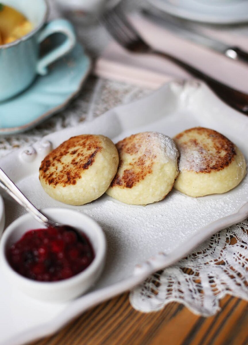 По рецепту Антона Кочуры, шеф-повара ресторана «ОнегинДача» Это легкий и универсальный рецепт сырников, для которых не нужен домашний творог от бабушки с рынка. Все просто: покупайте творог 9% «Простоквашино», доступный в любом гастрономе, и следуйте рецепту. И точно не ошибетесь. Главный лайфак этого рецепта: замесите творожную массу накануне, вечером, поставьте в холодильник, а утром спокойно выпекайте. И вы получите идеальные сырники. Смешиваем творог и манную крупу с яйцом, добавляем сахар. По желанию можно добавить щепотку соли, ванилина, ванильной эссенции или ванильного сахара. Убираем массу в холодильник. Наутро из получившейся массы формируем небольшие шарики, слегка планируем в муке и обжариваем на подсолнечном масле до образования золотистой корочки. При желании доводим до готовности в духовке при температуре 180° в течение 3-5 минут. Все готово. Варенье, сметана, сахарная пудра, сироп, мед, перетертые с сахаром ягоды, ванильный соус, шоколадная паста, изюм, чай, кофе, какао