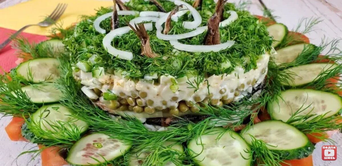 Четвёртый слой: зелёный горошек + немного майонеза.