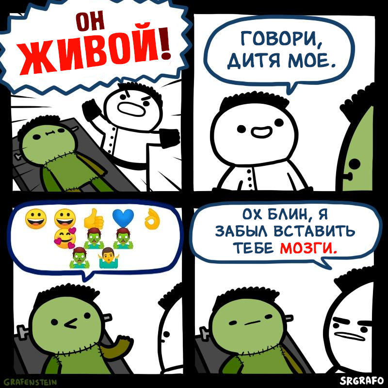 Комикс о профессоре Франкенштейне и его монстре с самого начала создавался как шаблон для мема - 11 октября 2019 года художник под ником SrGrafo выложил четырехпанельный комикс с пустым облачком в третьем кадре, куда подписчикам было предложено придумать и вставить какую-нибудь подходящую по смыслу шутку. Суть мема заключается в том, что монстр Франкенштейна произносит что-нибудь нелепое или оскорбительное, и тогда профессор вспоминает, что забыл вставить ему мозги.