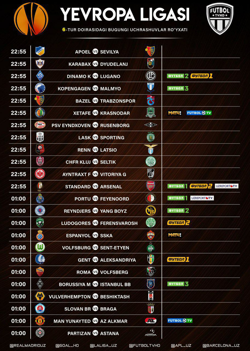 💛 Yevropa Ligasining bugungi uchrashuvlar ro'yxati va ularni translyatsiya qiladigan telekanallar! 📺