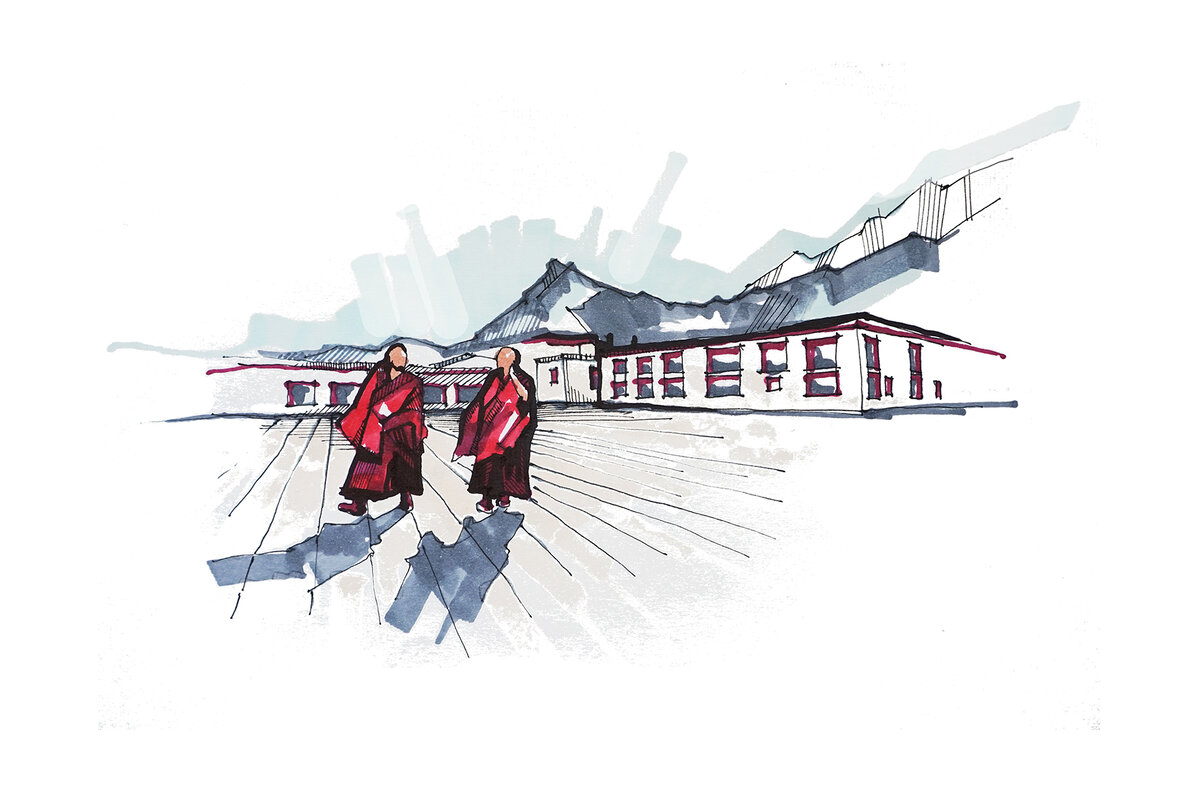 Через пару часов самолет начал медленно заходить на посадку в Лхасу. Минут тридцать мы летели сквозь предгорье Гималаев очень близко к земле. Нас окружала длинная песчаного цвета долина, разрезанная гладью рек с маленькими деревьями далеко внизу. Где-то вдалеке виднелись крошечные редкие поселения. Ребята столпились у иллюминаторов, приготовив телефоны.