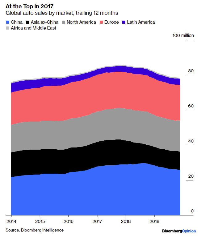 Ни для кого не секрет, что автомобильный рынок во всем мире был охвачен рецессией, которая, похоже, не планирует в ближайшее время замедляться. Мы подробно рассмотрели падение продаж автомобилей не только в США, но и на ведущих мировых рынках, таких как Китай и Европа, за последние 18 месяцев. Мы также рассмотрим вопрос о том, как роста продаж электромобилей и инвестиций в электромобили может быть недостаточно, чтобы спровоцировать восстановление отрасли, особенно в таких крупных городах, как Пекин, которые начинают сворачивать субсидий на их покупку. Инфекция распространилась, и новая статья Bloomberg включает в себя четыре графика, которые показывают, насколько разрушительными были последствия в глобальном масштабе. Первый показывает, что глобальные продажи автомобилей достигли пика два года назад, составив чуть менее 86 миллионов. В октябре это число составило 78 миллионов, снижение составило около 9%. На втором графике показаны тенденции всего мира, причем, поскольку рынок Китая