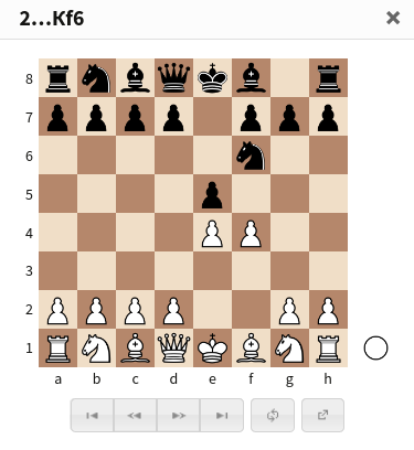 Чигорин — Бернштейн, 1903 1.e4 e5 2.f4 Редкий, но допустимый ход, хотя всё-таки «лучший способ опровержения гамбита — в его принятии», но против мастеров этого начала, таких как Чигорин, не каждый рискнёт доказывать парвоту этого принципа. Самое лоогичное, хотя и ход 3. Кf3 не хуже и ведёт к острой борьбе в духе этого начала. Этот ход чёрных и следующий ответ белых, пожалуй, обязательны. Сейчас даже детишек учат - ферзю без фигур в поле делать нечего! Чигорин спокойно развивает фигуры, понимая, что две пешки подходящая цена за большой перевес в развитии. Детский оптимизм. Белые сильно опередили в развитии - против единственной действующей фигуры чёрных мобилизовались четыре белых. При этом чёрный ферзь уж лучше бы стоял на месте, чем на одной открытой вертикали с королём. Если до сих пор позиция чёрных была плоха, то теперь, после "тихого хода" белых она становится полностью проигранной. Ферзь берёт под контроль поле e1, куда может встать ладья и открывает слону дорогу на h5, уже с у
