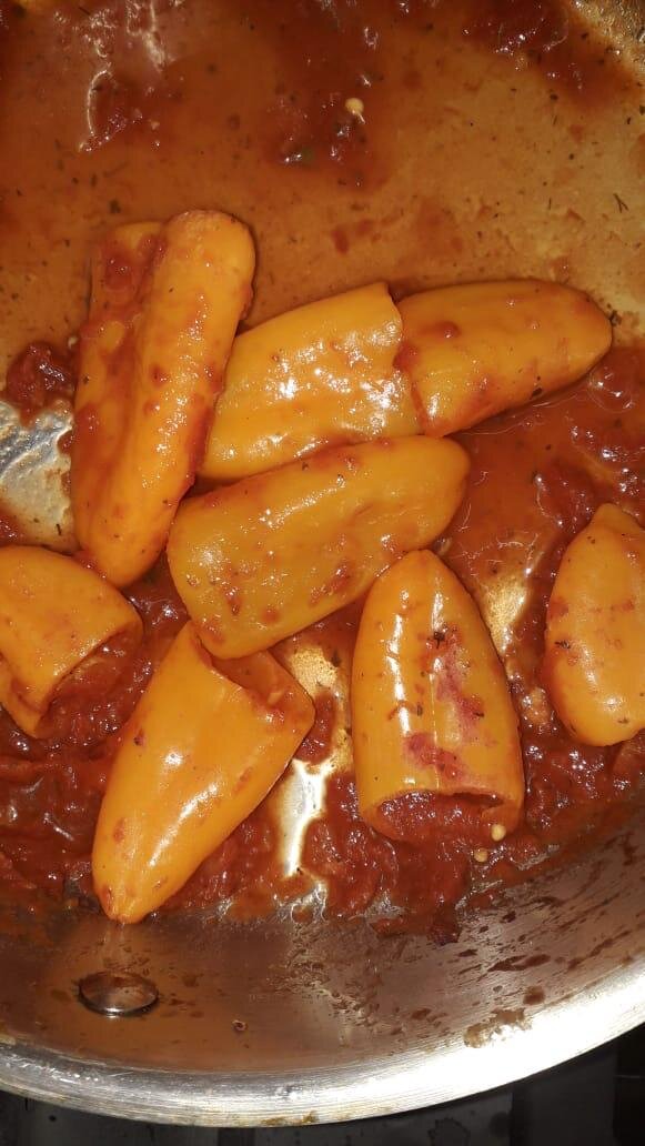 Болгарские перчики с консервированными помидорами, чесноком и хмели-сунели. Быстрый и полезный гарнир к чему угодно.