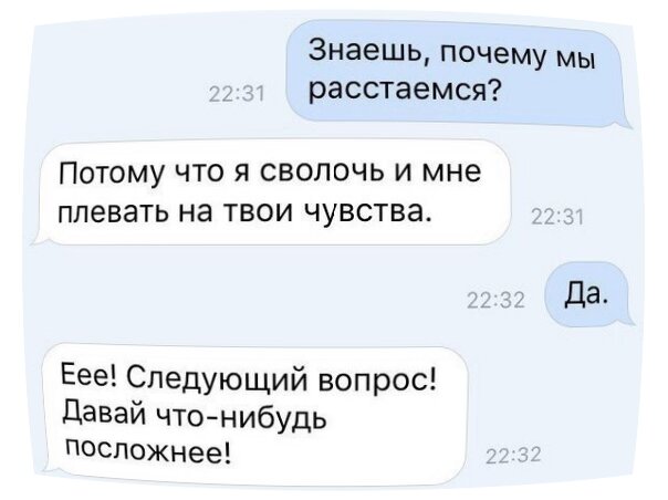 Продолжаем марафон смеха и веселья! Признаться я не совсем понимаю что происходит вокруг, но не об этом. меньше пейте кофе господа. особенно когда болеете, и температура 38,8 :) Расставаться - это целое искусство, большинство не знает как это делать правильно. Но видимо в этой паре как расстаться красиво знает именно тот, кого бросают. И не особо он расстроен видимо. Хотелось бы и мне мерить деньги кучами, в таких случаях и счет не нужен. Одну кучу на квартиру, другую на машину, а на третью я в отпуск поеду. Но увы и ах, не получается. Точнее получается как у героя следующей переписки. А главное какое название красивое, как какой-то диковинный напиток. А на поверку оказалось всё банально, хотя и не заурядно. Даже не представляю, что со мной бы стало, если бы я попил из Кубани. На кубани вода жесть из под крана, а уж про речку я вообще молчу... Из ресторана есть несколько путей. Один из стандартных видов выхода из него оказался не таким стандартным, точнее подход к нему оказался довол