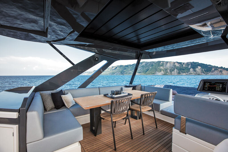 Вместо кормового гаража в транце яхты скрывается откидной диван с навесом от солнца, который превращает эту зону в подобие пляжного клуба на больших яхтах. Отсюда очень удобно приглядывать за детьми, купающимися в море, также в этом приватном уголке будет хорошо посидеть с удочкой или просто поболтать ногами наедине с морем. В другом варианте исполнения здесь предусмотрен отсек для хранения двух Seabob.