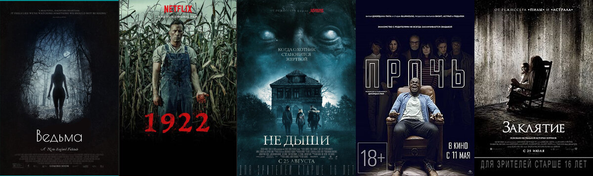 Очень интересный сборник ужасов, советую посмотреть трейлеры, многие из них атмосферные и погружают в фильм с головой. 1. Ведьма (2015) В 1630 году семья колонистов покидает плантацию, чтобы жить на уединенной ферме рядом с лесом в Новой Англии. Но вскоре младший ребёнок, ещё младенец, исчезает. 2. "1922" (2017) Фермер Уилфред Джеймс с помощью сына-подростка убил жену и бросил её тело на растерзание крысам. С тех пор крысы-трупоеды следуют за Уилфредом по пятам, ломая ему жизнь и доводя до безумия. 3. Не дыши (2015) Грабители забираются в дом одинокого слепого старика с целью украсть огромную сумму, которая, по слухам, спрятана где-то внутри. Казалось бы — что может быть проще, чем вынести деньги из дома практически беспомощного человека. Но они жестоко ошибаются: преследуемый становится преследователем. И тайна, которую он хранит, гораздо страшнее, чем обычные пенсионные накопления. 4. Прочь (2017) Знакомство с родителями подружки не предвещает молодому фотографу из Нью-Йорка ниче