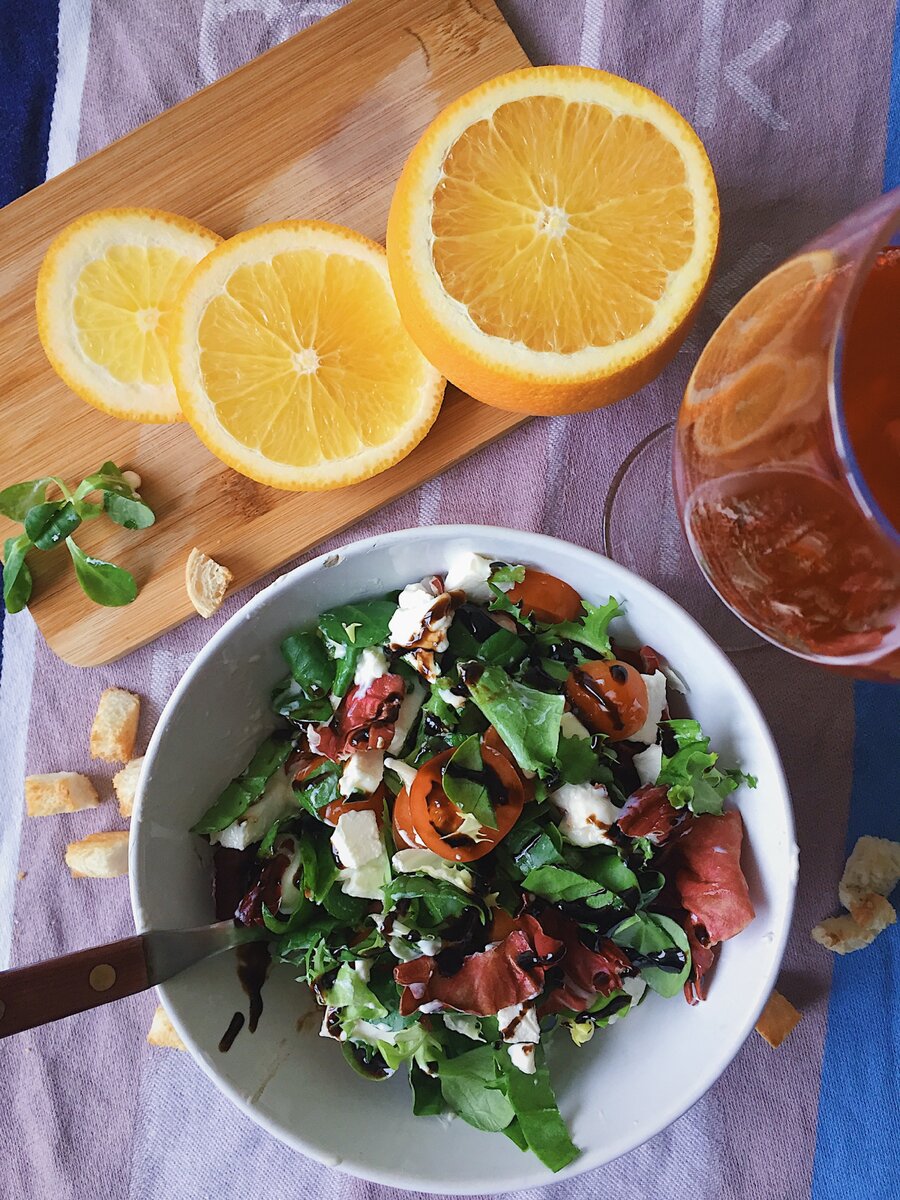 всего за 2 минуты.. Удивительный салат: летом освежает, а зимой вдохновляет и дарит солнечное настроение! Ингредиенты: любая смесь салата, огурцы, сыр мацарелла, апельсины, бальзамический соус. Приготовление: в миску выложить смесь салатов, помидоры черри, разрезанные пополам, рвем руками сыр, дольки апельсина режем поперек на треугольники, все смешиваем, сверху поливаем бальзамическим соусом! А еще есть другой вариант этого салата. Все ингредиенты, кроме сыра перемешиваем, кладем теплую жареную печень и получаем теплый салат, апельсин изумительно подчеркивает вкус печени, салат освежает, бальзамический соус придает пикантности, а для остроты можно добавить горчицу по-дижонски! Это очень вкусно! Поверьте!! Буду рада лайкам и комментариям, ну так, чтобы понимать, что не зря делюсь))