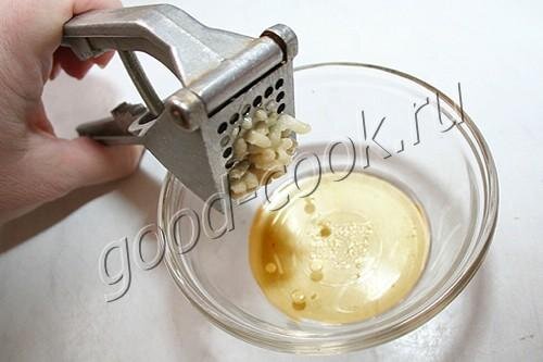 В небольшую мисочку налить растительное масло и положить продавленный через пресс чеснок.
