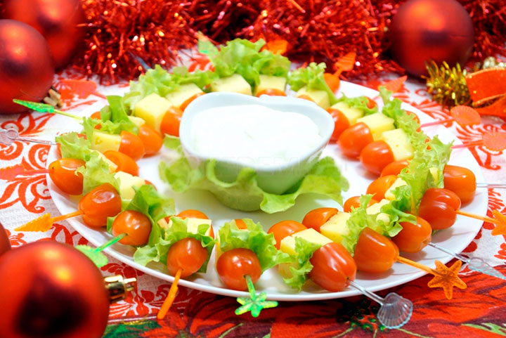 - Нанизать на шпажки половинки помидор, сыр, листочки салата.