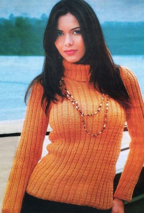 Размер: 42-44 Вам потребуется: 600 г пряжи оранжевого цвета (100% акрил); крючок № 3. Техника вязания. Рельефный ст. с/н, лицевой: вязать ст. с/н, обводя петлю нижнего ряда с лицевой стороны на изнаночную сторону. Рельефный ст. с/н, изнаночный: вязать ст. с/н, обводя петлю нижнего ряда с изнаночной стороны на лицевую сторону. Фантазийный узор: число петель кратно 4. Вязать по схеме. Повторять 4-й и 5-й ряды. Плотность вязания: 18 п. = 10 см. ОПИСАНИЕ РАБОТЫ Спинка: набрать цепочку из 80 возд. п. и вязать узором по схеме. На высоте 42 см закрыть для пройм с обеих сторон в каждом ряду 3 п., 2 п. и 2 раза по 1 п. = 66 п. На общей высоте 63 см, получив по 15 п. для каждого плеча и 36 п. для выреза горловины, закончить вязание. Перед: вязать, как спинку. На высоте 53 см закрыть для выреза горловины центральные 16 п., по обе стороны от них в каждом ряду 2 раза по 3 п. и 2 раза по 2 п. На общей высоте 63 см, получив по 15 п. для каждого плеча, закончить вязание. Рукава: наб