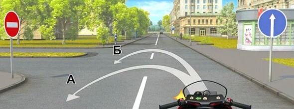 Здравствуйте дорогие читатели и гости канала Pro Би-Би! Сегодня с Вами разберем еще один вопрос на знание ПДД. Вопрос не особо сложный, но все равно некоторые совершают ошибку. И мы сегодня его разберем. В экзаменационном билете есть есть вот такой вот вопрос, в котором спрашивается: По какой траектории Вам следует выполнить разворот? Давайте разберемся в этой ситуацией. Мы видим что примыкающая слева дорога имеет две проезжие части, так же у нас есть знак "Движение только прямо". Знак стоит на первом пересечение, и значит поворот и разворот тут невозможен. Разворот по траектории А будет нарушением ПДД. На второе пересечение знак уже не действует. Из правил мы знаем, что действия знака распространяются до ближайшего перекрестка. Значит по траектории Б мы можем как выполнить разворот, так и развернуться. И так, разобравшись во всем, приходим к выводу, что развернуться мы можем только по траектории Б. И значит на экзаменационный вопрос ответ будет Только по траектории Б. Если спр