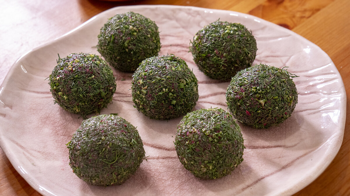Пучок укропа мелко рубим. Скатываем из свекольной массы шарики и обваливаем их в нарубленном укропе. Оригинальная на вид закуска готова.