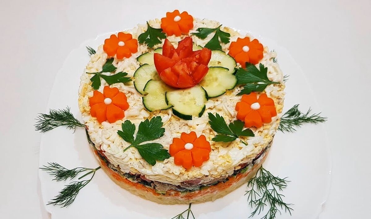 Шикарный праздничный салат. Обязательно попробуйте его приготовить! Ингредиенты: 1. Картофель - 2 шт. 2. Куриные яйца - 4 шт. 3. Морковь - 2 шт. 4. Помидоры - 2 шт. 5. Свежие огурцы - 2 шт. 6. Шпроты - 240 гр. 7. Соль, перец - по вкусу. 8. Майонез - по вкусу. 9. Свежая зелень (зеленый лук и укроп) - по вкусу. Способ приготовления: 1. Куриные яйца, морковь и картофель отварить до готовности, а затем натереть на крупной терке. 2. Помидоры и огурцы нарезать кубиком. Жидкую середину у помидора необходимо убрать. 3. Свежую зелень мелко нарезать. СБОРКА САЛАТА: На большую плоскую тарелку установить разъемное кольцо. 1 СЛОЙ - картофель. Хорошенько разровнять и немного уплотнить. Немного посолить, поперчить и смазать майонезом. 2 СЛОЙ - морковь. Разровнять и уплотнить. Слегка посолит и смазать майонезом. 3 СЛОЙ - огурцы. 4 СЛОЙ - мелко нарубленная зелень. Слегка посолить и смазать майонезом. 5 СЛОЙ - Равномерно выложить шпроты. Их можно выложить целиком или размять вилкой. 6 СЛ