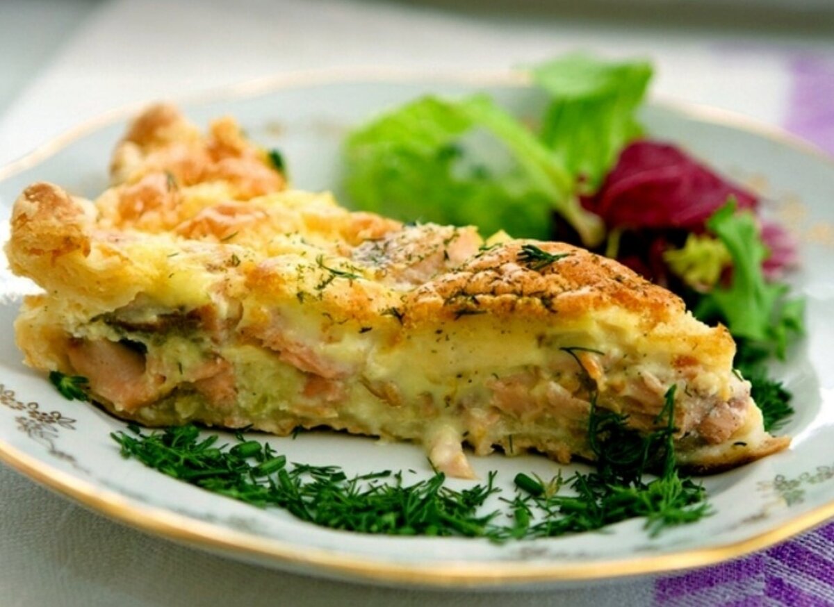 Картофельная запеканка с рыбой и грибами
