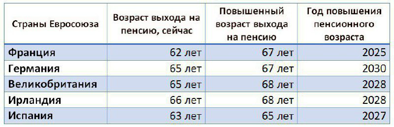 Пока в России все ворчат по поводу пенсионной реформы, в Европе начинают еще одну волну повышения пенсионного возраста. Население стареет, а вместе с ним растет бюджетный дефицит. Чтобы спасать социально-экономическое положение Европы, руководство вынуждено вновь повысить минимальный порог выхода на пенсию. Уже 31 страна из 35 перешла на повышение пенсионного возраста. Во Франции выйти на пенсию можно лишь в 62 года. К 2025 году только в 67 лет французы смогут уйти на пенсию. Сейчас во Франции действуют квоты для транспортников и электриков, для которых снижен минимальный порог. Но эти квоты планируют отменить, а заодно и повысить трудовой стаж. Если посмотреть на таблицу, то в Великобритании - максимум - там планируют повысить порог до 68 лет.