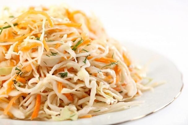 ► Салаты ИНГРЕДИЕНТЫ: ПРИГОТОВЛЕНИЕ: 300 гр белокочанной капусты промываем под холодной водой, чистим лук и морковь. Капусту нарезаем тонкой соломкой. Морковь натираем на крупной терке, лук нарезаем кубиками, чеснок либо мелко-мелко нарезаем, либо пропускаем через чесночницу. Все овощи перекладываем в одну посуду. Поливаем салат подсолнечным маслом и уксусом, добавляем немножко сахара и соли. Хорошенько перемешиваем - и салат из свежей капусты готов!