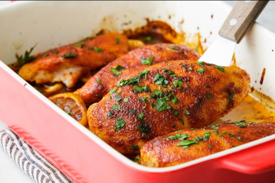 - Разогреть духовку до 180º. В небольшой миске смешайте коричневый сахар, чесночный порошок, паприку, соль и перец. Полить курицу маслом и щедро смазать смесью приправ, стряхивая излишки. Положите ломтики лимона в форму для выпечки, затем положите сверху курицу.