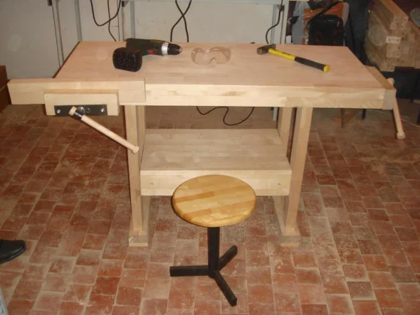 Определяя расстояние от пола до столешницы, лучше всего ориентироваться не на среднестатистические параметры, а на особенности собственной анатомии. Оптимально, если верхний срез ножек будет находиться на одном уровне с кистями рук. Если вы рассчитаете этот параметр с учётом толщины столешницы, то работать за таким верстаком без устали можно будет в течение нескольких часов.Крышка станка может изготавливаться из досок, деревянного массива или фанеры и представляет собой наборную конструкцию.Использовать ДСП или OSB в этих целях не рекомендуется. Профессиональные столяры давно уже определили оптимальный размер столешницы — максимум 2 м в длину и 0.7 м в ширину. На таком верстаке с одинаковым удобством можно изготовить и сборную деревянную дверь, и небольшую форточку.Проектируя сооружение, не стоит забывать и о прочности несущего каркаса. Для опорных элементов конструкции используют брус сечением не менее 100х100 мм. В качестве продольных и поперечных усиливающих элементов допускается использование реек и бруса сечением поменьше — от 50 – 60 мм и более. Стыки деталей монтируют на шипы или шканты, для прочности используют мебельные уголки и другую арматуру, а все соединения выполняют при помощи болтов и саморезов. Гвозди обеспечить требуемую устойчивость и фундаментальность конструкции не смогут.
