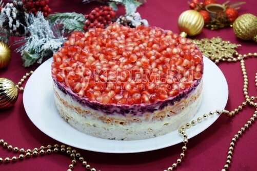Салат «Новогодняя Москва», это яркий праздничный салат с курицей, овощами и зернами граната. Ингредиенты: Куриное филе 300 г Сыр 100 г Зерна граната 100 г Яйца 3 шт Свекла 1 шт Морковь 1 шт Зубчик чеснока 2 шт Майонез5-6 ст. л. Приготовление: 1. Свеклу и морковь отварить, остудить и очистить. 2. Яйца отварить, остудить и очистить. 3. 300 г куриного филе промыть. 4. Отварить до готовности и остудить. 5. Мелко нарезать в миску отварное куриное филе. 6. Добавить 2 измельченных зубчика чеснока, 2 ст. ложки майонеза и перемешать. 7. Выложить слой курицы с чесноком и майонезом на блюдо в сервировочное кольцо. 8. Добавить слой тертого сыра. 9. Смазать майонезом. 10. Выложить слой тертой отварной моркови. 11. Смазать майонезом. 12. Выложить слой тертых отварных яиц. 13. Смазать майонезом. 14. Выложить слой отварной свеклы. 15. Смазать майонезом. 16. Добавить зерна граната сверху и поставить в холодильник на 30 минут. 17. Салат «Новогодняя Москва» готов. Снять сервировочное кольцо и подав