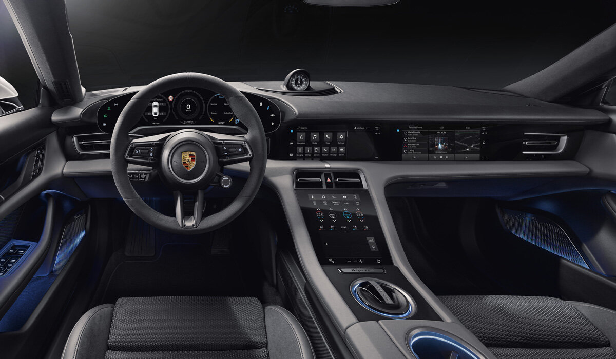 В салоне сохранены традиционные черты автомобилей Porsche, однако аналоговых кнопок и переключателей почти не осталось. Перед водителем — гнутый дисплей приборов диагональю 16,8 дюйма, у которого есть четыре режима отображения, а по краям расположены сенсорные кнопки включения наружного освещения и изменения режимов движения. Главная клавиша «запуска двигателя» размещена на традиционном для автомобилей Porsche месте замка зажигания, то есть слева от руля. А сама баранка может быть двух видов — стандартная и «спортивная», с вращающимся переключателем режимов ездовой электроники.