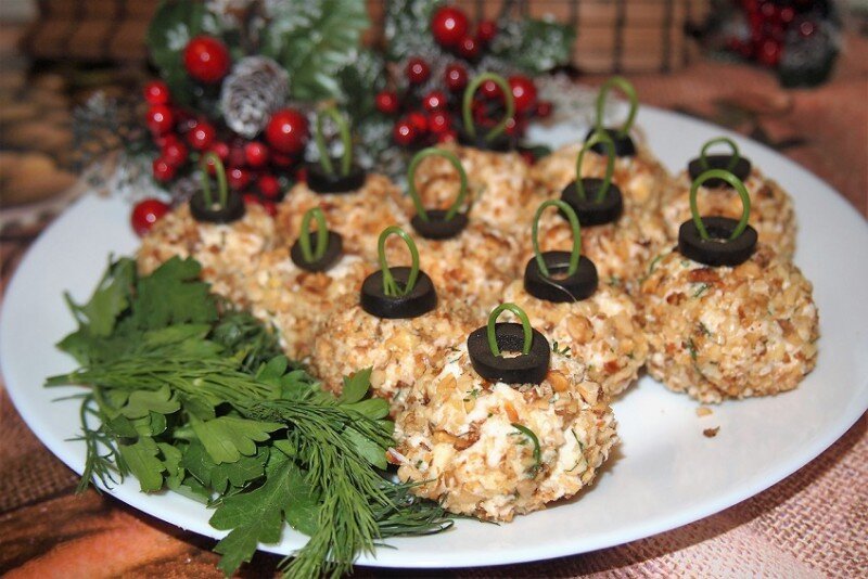 Сегодня приготовим с вами праздничную закуску "Ёлочные шары" на новогодний стол. Нам понадобится : - филе куриной грудки (300 г) - сыр (200 г) - зелень (по вкусу) - грецкие орехи (горсть) - чеснок (по желанию) - майонез (или другой соус по желанию) - оливки Процесс приготовления: Шаг 1 Филе куриной грудки отвариваем в подсоленой воде (15-20 минут) и мелко нарезаем. Сыр трем на мелкой терке. Шаг 2 Зелень мелко режем. Грецкие орехи измельчаем. Шаг 3 Добавляем раздавленный чеснок. Просто смешиваем все компоненты и заправляем майонезом. Шаг 4 Скатываем из полученной массы шарики. Шаг 5 Обваливаем в ореховой крошке, из половинок оливок делаем «крепления», из зелени — петельки. Надеюсь вам понравился рецепт, жду ваших лайков и подписок. А так же пишите в комментарии какие блюда вы хотите увидеть у меня на канале, а что вам уже удалось приготовить по моим рецептам. Буду рада любой активности. Спасибо за внимание!