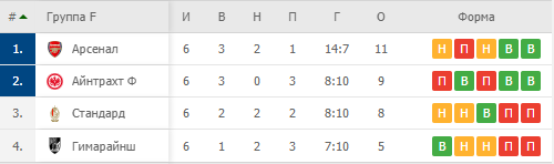 Этот результат, совместно с проигрышем «Айнтрахта» в яркой и результативной игре с «Гимарайншем», позволил «Арсеналу» занять первую строчку в группе.