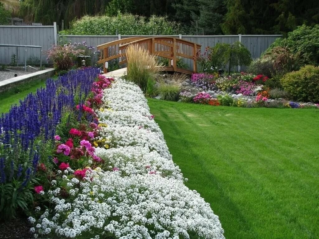 - иногда растения высаживаются небольшими группами, и низкорослые растения могут огибать или окружать высокорослые цветы.