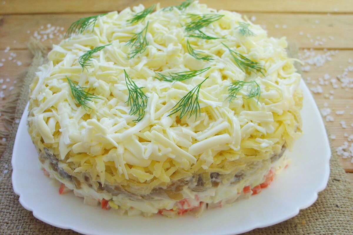 Обычно в салатах присутствует один основной ингредиент в виде мяса, рыбы или морепродуктов. К мясным компонентам еще частенько добавляют грибы. Салат званый ужин отличается тем, что в его составе есть и крабовые палочки, и грибы. В этом его основная изюминка. Салат весьма необычный, но очень вкусный и сытный. Ингредиенты: Порядок приготовления 1. Подготовить все необходимое. 2. Репчатый лук очистить и нарезать четвертькольцами. Шампиньоны вымыть и измельчить пластинками. Выложить лук и грибы в разогретую сковородку и жарить, помешивая, пока лук не станет мягким, а шампиньоны не потемнеют. Посолить. 3. Для формования салата удобнее всего пользоваться кулинарным кольцом или разъемной формой, здесь диаметр 20 см. Установить ее на плоскую тарелку, высыпать нарезанные мелко крабовые палочки. Покрыть майонезом. 4. Следующий компонент - кубики вареных яиц. И снова нанести тонкий слой майонеза. 5. Далее распределить обжаренные с луком шампиньоны. Промазать майонезом в последний раз. 6. Посыпа