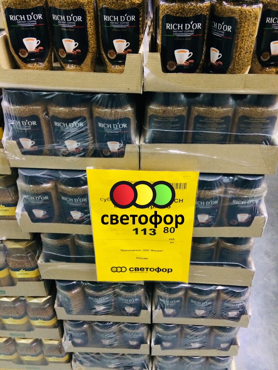 Доброго времени суток, читатель. Рассказать и показать сегодня хочу, что интересного нашла. В альтернативу обычным продуктам. и начать хочу с того, что сама люблю - это #кофе обычно мы покупаем кофе "jacobs", и тут, в магазине #Светофор кстати он тоже есть. Но сегодня о другом. ☕ кофе растворимый сублимированный “RICH D’OR” Бюджетный кофе. Но, думаю ничем не хуже другого сублимированного кофе. А вообще смотрела «контрольную закупку», там также говорится, что кофе производителя "Jacobs" один из самых лучших. ☕ Азерчай "Астара Букет" Так не разу и не пила этот чай, который активно рекламируется и по телевизору и в интернете. Вообще чай не очень люблю. Обычно завариваю травы с ягодами. Или компоты. И кофе с водой. Но для тех кто любит. Знайте, есть тут такой чай. В листьях. ☕ чай в пакетах "принцесса Канди" может быть на дачу или ещё куда, в общественное место пригодится. Обычный чай в большом количестве, в пакетиках. Конечно, опять же за такую цену ожидать, что там будут чайные л