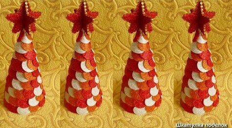 Доброго времени суток друзья мои. Сегодня хочу предложить вам как можно в домашних условиях сделать мини елочку своими руками.Это очень интересно.Да и времени у вас она займет немного. Что нужно для такой ёлочки: *Фоамиран блестящий у меня был самоклейка (если такого нет можно заменить на простой блестящий фоамиран и клеить тогда на горячий клей). *лист А 4 для конуса ёлки *Стразы *Термоклей И так берем в руки цветной картон с помощью карандаша рисуем конус,отрезаем, затем скручиваем и склеиваем его термоклеем. Внутрь конуса можно положить смятую газету,вату или что найдете, чтобы наполнить конус. Затем дно тоже заклеиваем оставшимся кусочком от цветного картона. Лишнее обрезаем. Дальше берем самоклеющийся фоамиран. Цвет выбираете на свой вкус.Можно зелененькую полностью сделать елочку, можно как у меня разноцветную. Рисуем на ней кружочки, я использовала крышку от пластиковой бутылки в качестве шаблона. И вырезаем их. Эти кружочки клеим на конус отрываем бумагу от фоами