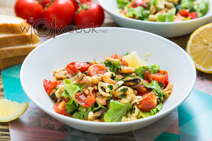 Теплый салат с морепродуктами готов, приятного аппетита! Обратите внимание, помидоры почти сырые, как и лук. Это очень вкусно! А любителям креветок понравится также этот рецепт салата "Царский".