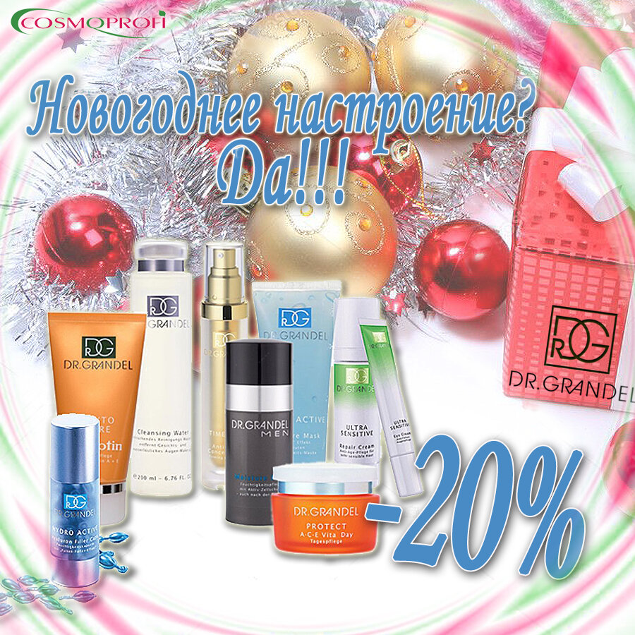 Как подарить новогоднее настроение? Уже совсем скоро наступит Новый год, один из любимейших праздников! Для большинства предновогодняя пора — очень интересное, веселое время, наполненное приятными хлопотами, а главное, ожиданием чуда, ожиданием того, что вот совсем скоро уйдут все горести и беды старого года, и придет новый добрый, удачный, счастливый год! Представляем новогодние хлопоты, которые помогут вам уловить желанное новогоднее настроение: 1. Составляем новогоднее меню. 2. Украшаем дом. 3. Подготавливаем подарки и продумываем поздравления. 4. Выбираем новогодний наряд и макияж. А для любой женщины главный атрибут «новогоднего настроения» – это ощущение своей неповторимости и обворожительности! И помогает ей в этом мощная косметическая индустрия, достойным представителем которой вот уже более семидесяти лет является немецкая компания Dr.Grandel, а мы предлагаем сегодня воспользоваться новогодней акцией: скидка 20% на всю продукцию марки Dr.Grandel!!! Оформить заказ: http://ww
