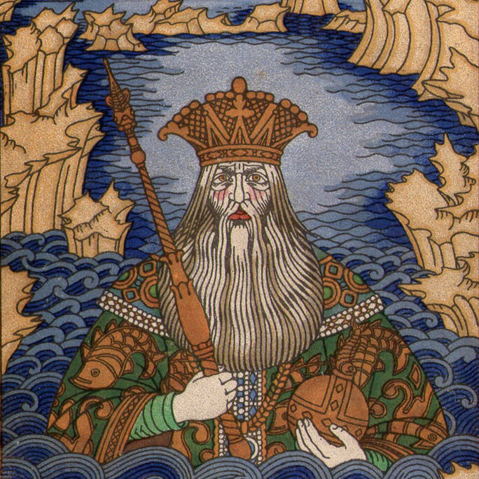 Один из самых могущественных владык былинного мира Морской Царь. Одним своим движением он может вызвать шторм или утихомирить стихию. Особенно Морской Царь почитаем у приморских народов промышлявших ловлей рыбы и морской торговлей. Купцы и рыбаки платили царю дань, в древние, времена это могло носить фирму человеческих жертвоприношений. За долгие годы взимания дани с купцов у него скопились огромные богатства. Кидать в воду мусор или загрязнять как то по-другому, было недопустимо, это могло вызвать гнев Морского Царя. Современная традиция бросать в воду монеты, отголосок обычая уплаты дани Морскому Царю. Морской властитель проживает в синем море, во дворце, он окружён красотой и прекрасными девами, царь тонкий ценитель искусства. Мир, в котором проживает Морской Царь похож на наш, только гораздо красивее. При нем находится его царица Водяница. Девы, возможно, все они дочери Царя, олицетворяют реки, а царица Водяница, возможно пресную воду. В некоторых былинах волшебные и незауря