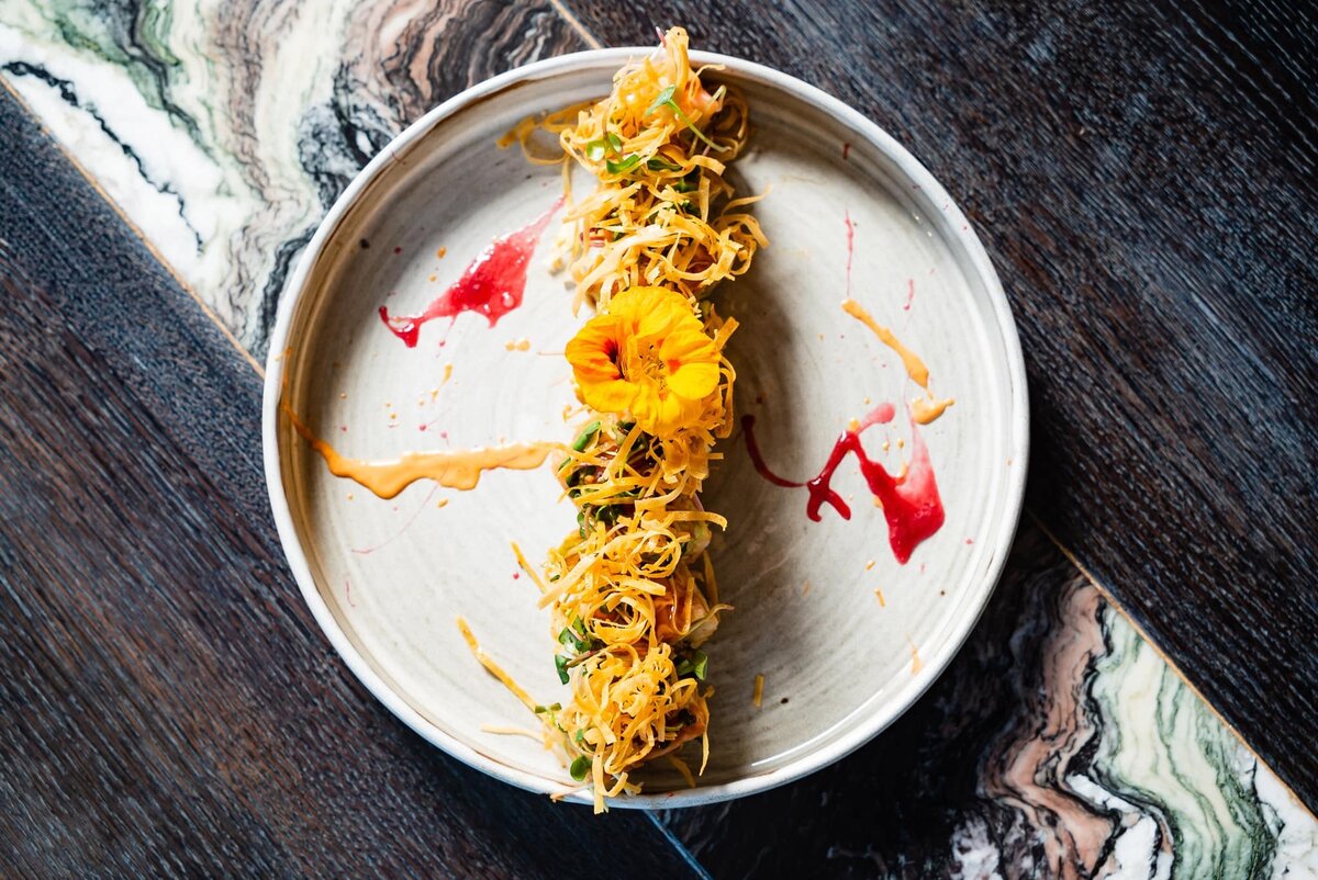 Лосось, авокадо, грейпфрут, сливочный сыр, соус терияки, соус спайси, рис, нори, кранч, микро-грин (редис), апельсиновый перец