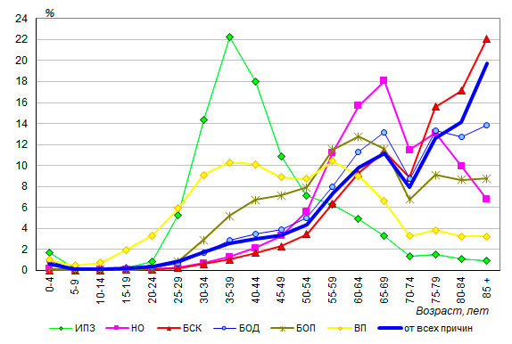 Изменение значений возрастных коэффициентов смертности от болезней системы кровообращения, особенно в старших возрастных группах, в основном соответствует изменению возрастных коэффициентов смертности от всех причин смерти. В младших и средних возрастах вклад болезней системы кровообращения в общую смертность невелик, хотя и повышается с возрастом (от 1,4% в возрасте до года до 9% в возрасте 20-24 лет и 32% в возрасте 45-49 лет). В старших возрастных группах вклад смертности от болезней системы кровообращения в общую смертность существенно повышается – почти до 60% в возрасте 75-79 лет, хотя в самых старших группах несколько снижается, составляя около 53% в возрасте 85 лет и старше.