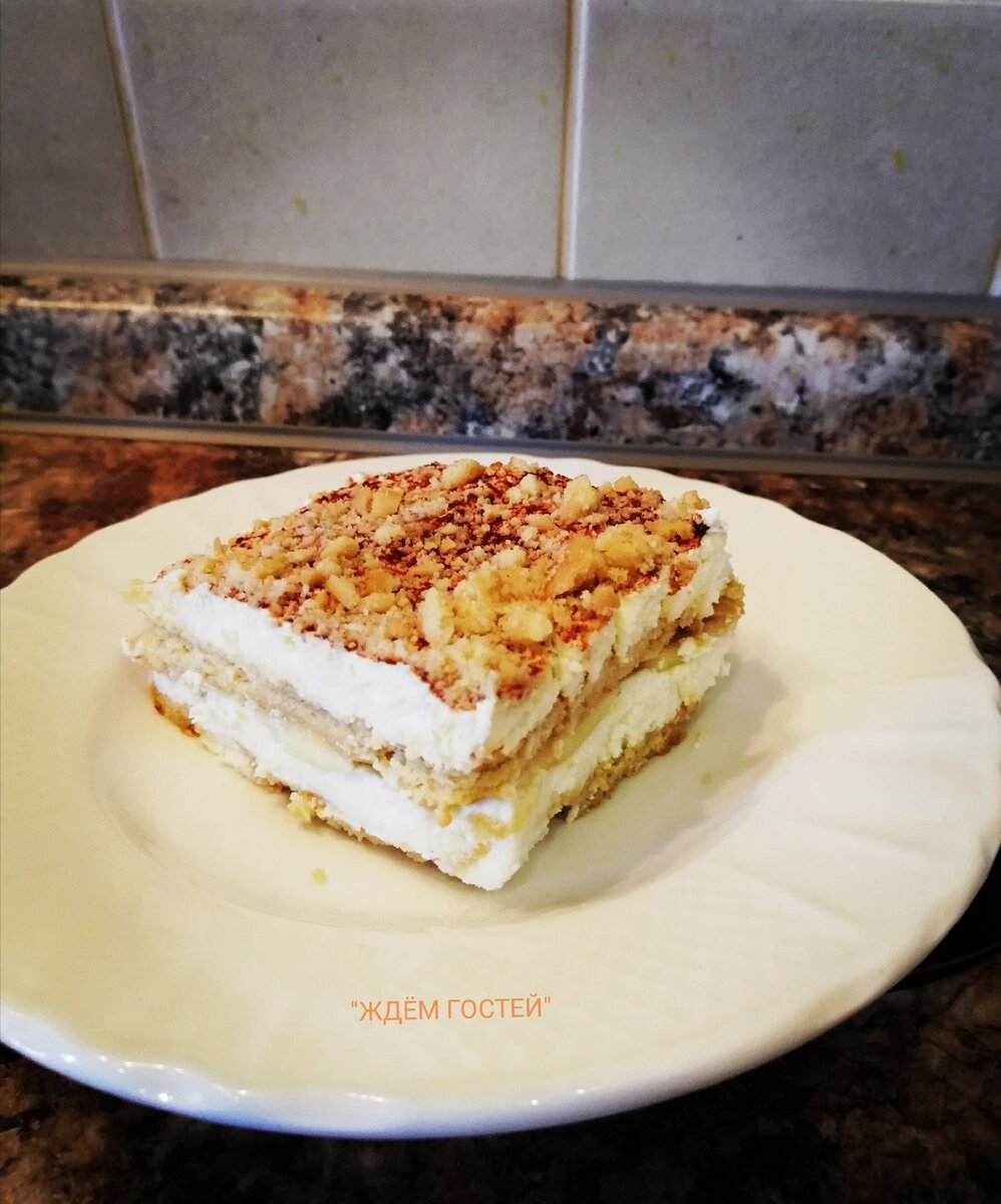 Очень нежный и вкусный десерт. Сегодня будем готовить очень вкусный, нежный и быстрый в приготовлении тортик. С его приготовлением справиться даже ребенок. Для его приготовления мы будем использовать доступные продукты, это творог, сметану, бананы, сливочное масло, молоко и печенье. Если у вас нет времени приготовить торт, а гости скоро придут, то этот торт будет вашей палочкой выручалочкой. Приступим к приготовлению. Ингридиенты: - Творог 500 гр. - Печенье (К чаю) 500-600 гр. - Молоко 200 мл. - Масло сливочное 100 гр. - Сметана 50 гр. - Сахар (по вкусу) 150 гр. - Банан 2 штуки - Какао - порошок (для посыпки) 1 ч. л. Приготовление: Вначале приготовим крем. Взять творог, сливочного масла комнатной температуры, сахар и сметану взбить погружным блендером до состояния хорошего густого крема. Взять песочное печенье. Каждое обмакнуть в молоко, затем выложить в форму, один слой печенье, затем слой нашего крема, на крем слой тонких кружочков банана. Повторять сл