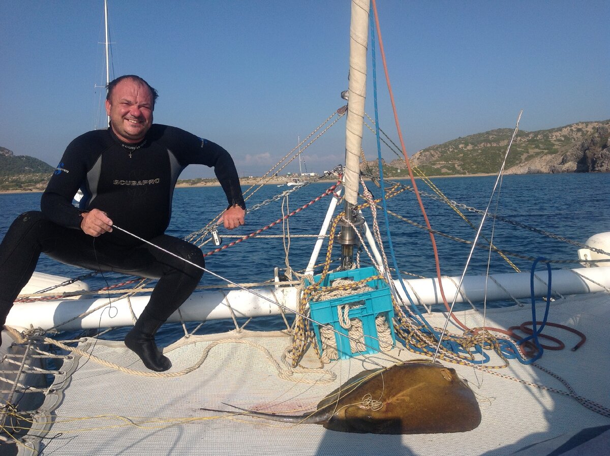 Вот тут я и совершил ошибку: пожарил печень ската. Пожарить не получилось: она просто перетопилась на рыбий жир, комки неперетопленного кое-как съели, гадость несусветная и всюду запах горелой рыбы. Стало ясно, что вечером жаренного ската не захотим. Второй ошибкой было вылить этот рыбий жир за борт. Три литра масла дали потрясающую пленку на пару гектар, море славно запереливалось всеми цветами радуги, перемазав нам борта и приглашая греческий костгард присоединиться к этому празднику. Вонь в комплекте. Высаживались на берег на динге, вывозили и ее. Проклятье.