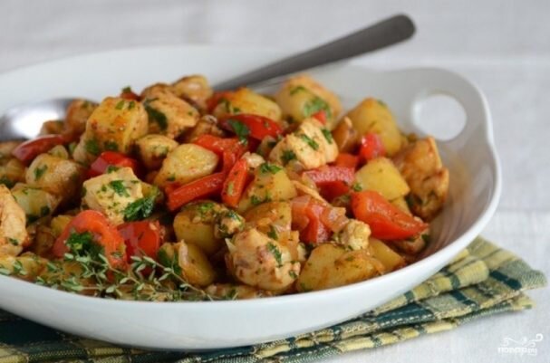 Ингредиенты для «Индейка с овощами в горшочке»: Время приготовления: 90 минут Количество порций: 5 Рецепт «Индейка с овощами в горшочке»: Для начала луковицу почистить, нарезать колечками и обжарить до золотистого цвета на сковороде. Ингредиенты в горшок выкладывать слоями. Первый слой - обжаренный лук. Индейку помыть, обсушить салфеткой, нарезать кубиками и положить на лук. Посолить и добавить специи. Морковь почистить, нарезать кольцами, выложить на индейку, посолить. На морковь выложить порезанный перец.