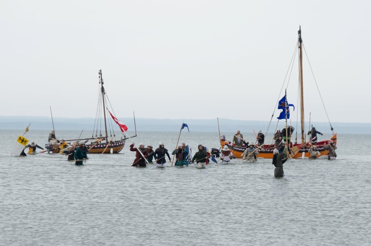 Всё это и многое другое на фестивале "Меч Александра" 😃😃😃 Но это не рекламный пост, а рассказ о том, как мы плавали на кораблях... Конечно, большой лодкой и даже речным походом сейчас мало кого удивишь. Любители раннего средневековья уже вовсю практикуют. Но для нас, сухопутных крыс, подобное, конечно же, в новинку. В этот раз, как я уже говорил, организаторы пообещали нам не один, а целых два корабля. И началось всё дело с того, что ваш покорный слуга, возглавив колонну европейских "захватчиков", ибо примерно помнил где находится пристань, выдвинулся к небольшой гавани. На подходе с удовольствием отметил, что нас не обманули и вдобавок к небольшому шестивесельному суденышку добавилось судно человек, наверное, на тридцать. Поскольку "Цитадель" двигалась первой в колонне, мы решили занять уже хорошо знакомое нам судно, поскольку наша небольшая дружина в 12 человек аккурат в него помещалась. Шведский же отряд с удивлением смотрел на длинную ладью, с опущенной мачтой и недоуменно сообр