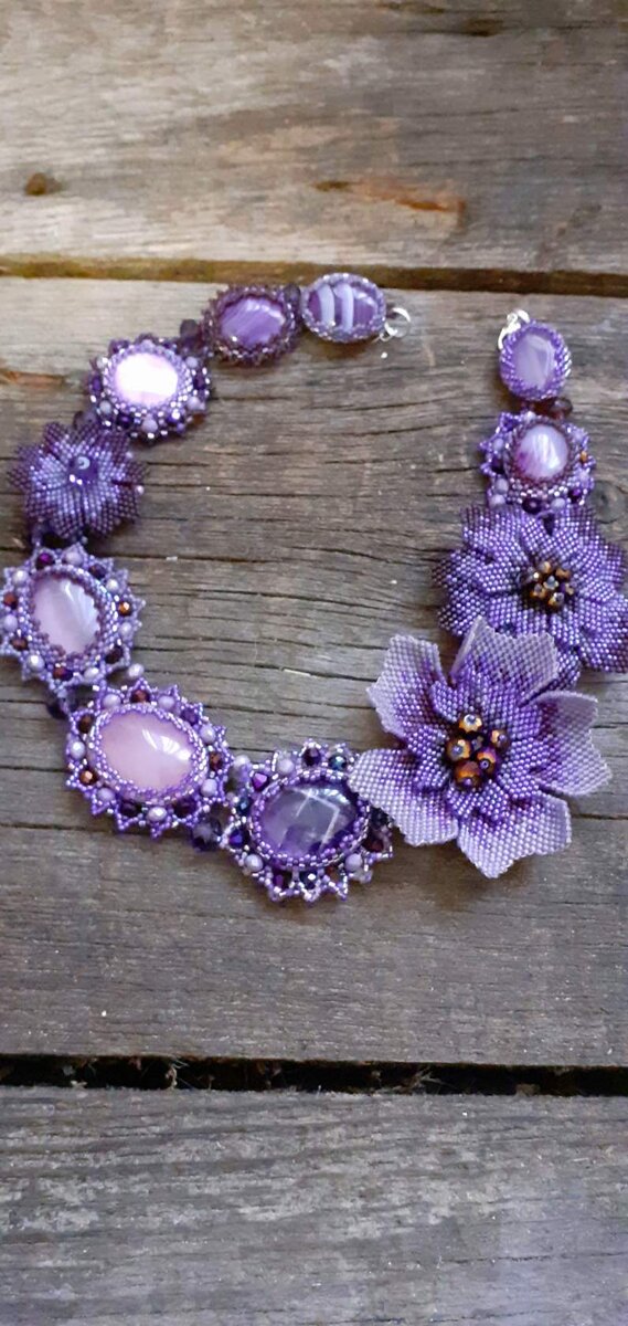 Лёгкое изысканное украшение. Сплетено из множества мелких деталей, но ничего лишнего. Смотрится элегантно и изящно. Вполне подойдёт для леди любого возраста ))). Замочек-карабин может застёгиваться на любом из звеньев бисерной цепочки-концевика, Потому, размерчик универсальный. Кроме того, универсальность колье ещё и в его цвете. Сочетание любимого почти всеми женщинами сиреневого и серебристого, подходит практически всем и брюнеткам , и блондинкам, и шатенкам. А кокетливо-игривый перелив хрустальных бусин ничуть не перегружает достойной красоты этого кружевного колье. И так, примеряем сиреневый?