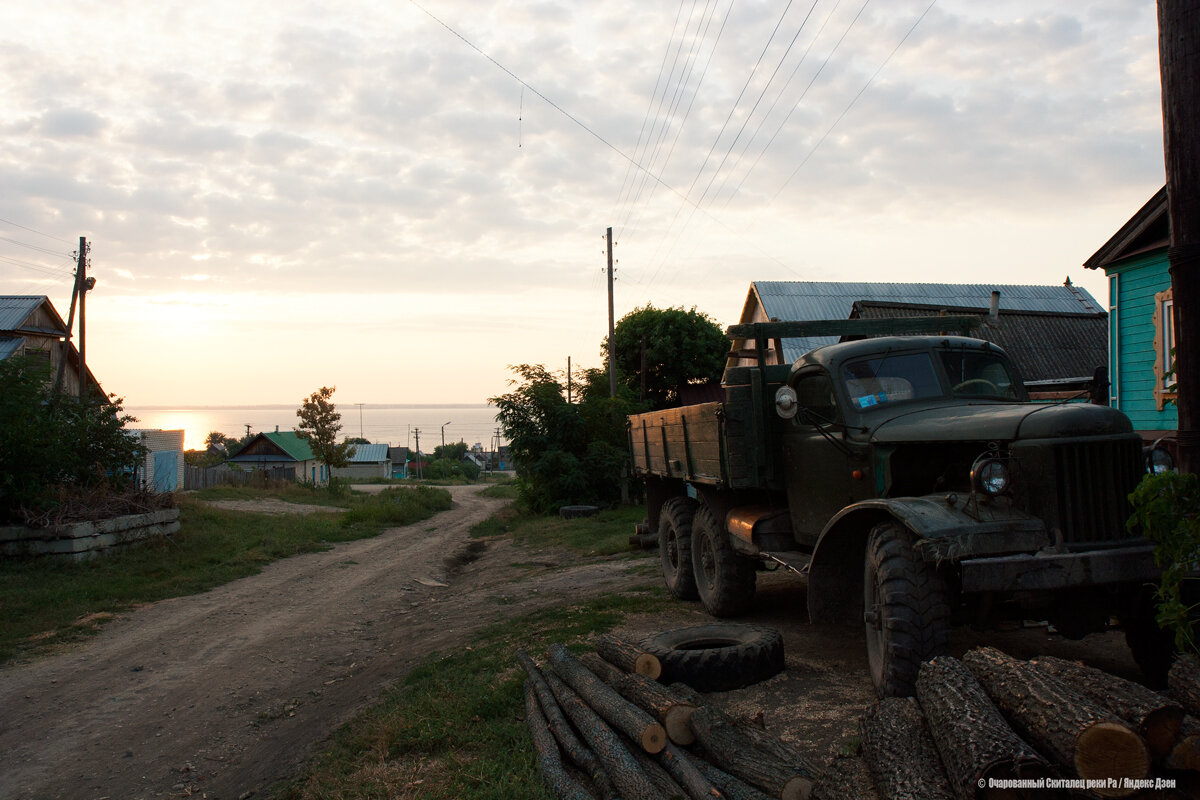 Наконец-то солнце заполнило своим заревом все вокруг, раскрасив воздух и землю в яркие и теплые тона... Рассвет встречен...Зарево пылает, играя бликами в линзах камеры. Можно идти и искать на паром в Духовницкое (где согласно незабытой еще песне "...надежду дарит на земле паромщик людям..."). Пробираюсь по пустым улицам, во дворах которых кое-где для острастки побрехивают собаки (на мое счастье ни одна не выскочила на дорогу и не поняла тревогу). В одном переулке на пути к Волге я набрел на пару старых грузовичков (по-моему марки ЗИС или ЗИЛ), стоявших прямо у ворот и было необычно видеть эту технику из прошлого в добротном состоянии. А солнце вместе с моим шагом отражалось в их покатых капотах, крыльях и боках бензобаков... Я потом не раз встречал такие грузовики именно под Хвалынском, где их, по всей видимости, использовали под развоз ульев на пасеки. А сейчас "старички" мирно "спали" как и весь город. Возможно, что сейчас, спустя десяток лет, их уже "списали" в утиль , а может они и колесят еще по дорогам Поволжья...