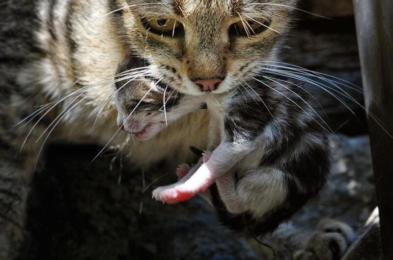 Из подвала соседнего дома показалась морда знакомого всем кота. Озираясь по сторонам кот рванул к своему подъезду, худющий и грязный, а в пасти он нес что-то непонятное (по-началу мы подумали, что он несет хозяйке пойманную мышку, как трофей). Марс пробыл в подъезде не больше пяти минут, когда он опять перебегал двор и нырнул все в тот же подвал. Через минуту кот уже бежал к своему дому с очередным комочком в пасти. Эту картину мы наблюдали трижды, а потом уже взяло верх над наблюдающими любопытство, ведь около подъезда не появилась баба Валя. Когда соседи подошли к порогу квартиры хозяйки, они обнаружили на коврике три маленьких пищащих комочка. Всего в тот день Марс перетаскал пятерых котят!!!