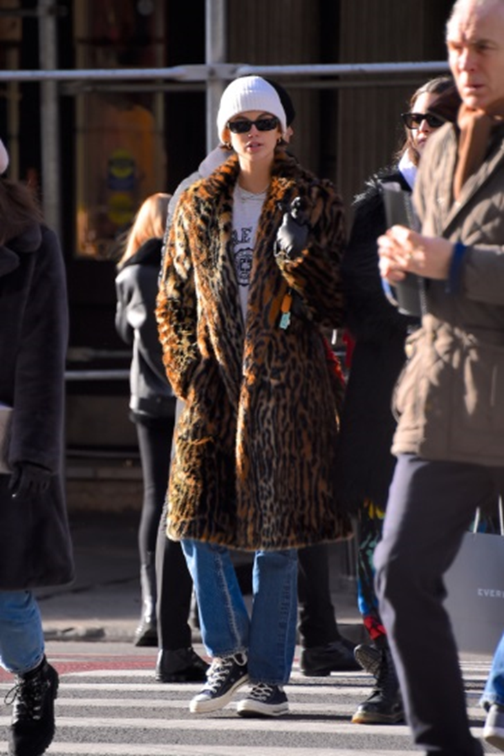 Женщин, которые любят носить шубки, не остановит любая погода. Восходящая звездочка модельного бизнеса Кайя Гербер показывает, как это можно сделать в городе, объединив в одном образе сразу несколько модных трендов и не превратившись в статусную "тетеньку". Образ в целом можно назвать олицетворением современного городского стиля и он подойдет практически любой женщине любого возраста и любой комплекции. В меру динамичный, в меру гламурный, в меру ироничный. И очень удобный. По фотографии сложно определить - из натурального меха эта шубка или искусственного, но леопардовый принт считывается легко. Анималистичные принцы - один из главный трендов сезона, а леопардовый уже стал классикой. Этот рисунок, если его правильно носить, может быть и дерзким, и роскошным, и чувственным, и кокетливым. Не даром его так любят главные мировые модницы. Читайте также: История леопарда. Анималистичный принт. В моде и не в моде. Комфортная длина шубки до колена позволяет защитить себя от холодного ветр