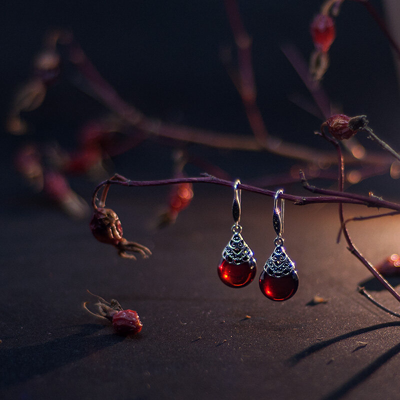 Серьги* потрясающе красивы: идеально отполированный гранат круглой плоской формы и глубоким насыщенным цветом красного вина в обрамлении роскошных аккуратных кружев червленого серебра. Камень играет на свету и внутри словно пляшут язычки пламени.