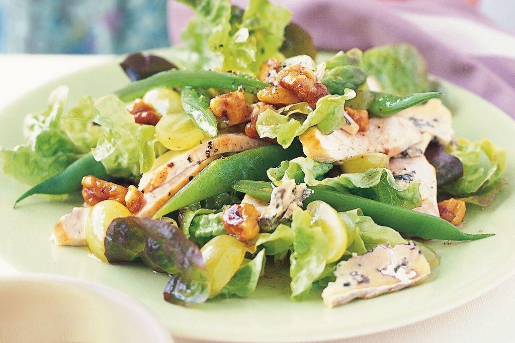 Когда хочется не только похудеть или поддержать свой вес, но и кушать что-то вкусное и быстрое, салаты становятся идеальным решением. Салаты с рыбой, мясом и куриной грудкой могут стать полноценным обедом, завтраком или ужином. Готовка занимает не так много времени, а на тарелке в итоге оказывается всё, что нужно организму – мясо, овощи, зелень, при желании – ещё и крупы. Но главный плюс таких салатов – количество калорий и ощущение насыщения от них. Делимся с Вами рецептами трёх салатов, которые помогут быстро, вкусно и полезно утолить голод. Салат с курицей и грецким орехом Полезный салат во французском стиле удивит тонкими сочетаниями вкусов. Кто сказал, что низкокалорийные блюда не могут быть такими же вкусными, как их «обычные» майонезные друзья? Необходимые продукты: - 400 гр. куриной грудки; - 150 гр. сыра «Рокфор» (или другого сыра на Ваш выбор); - 300 гр. стручковой фасоли; - 150 гр. винограда; - 100 гр. грецких орехов; - 40-50 гр. мёда; - 3-4 ст. л. оливкового масла; - 1 лим